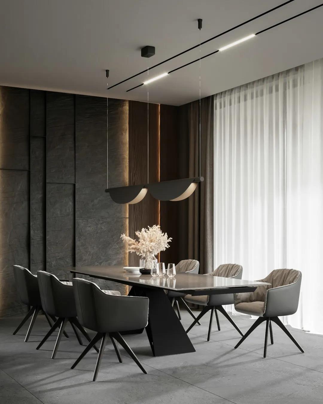 餐厨区域采用利落的线条丰富空间内涵,在简约灯饰点缀下,愈发让空间显露出优雅、宁谧的感觉。材质的魅力、色彩的渲染在空间呈现中自成一派,写意的空间艺术美学,极简的格调呼之欲出。